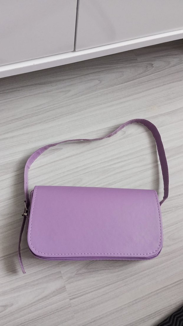 Pastel lila deri kadın çanta, sade desen ve tokalı askıyla minimalist ve karşı kültür stilini yansıtıyor. Günlük kullanıma uygun.
