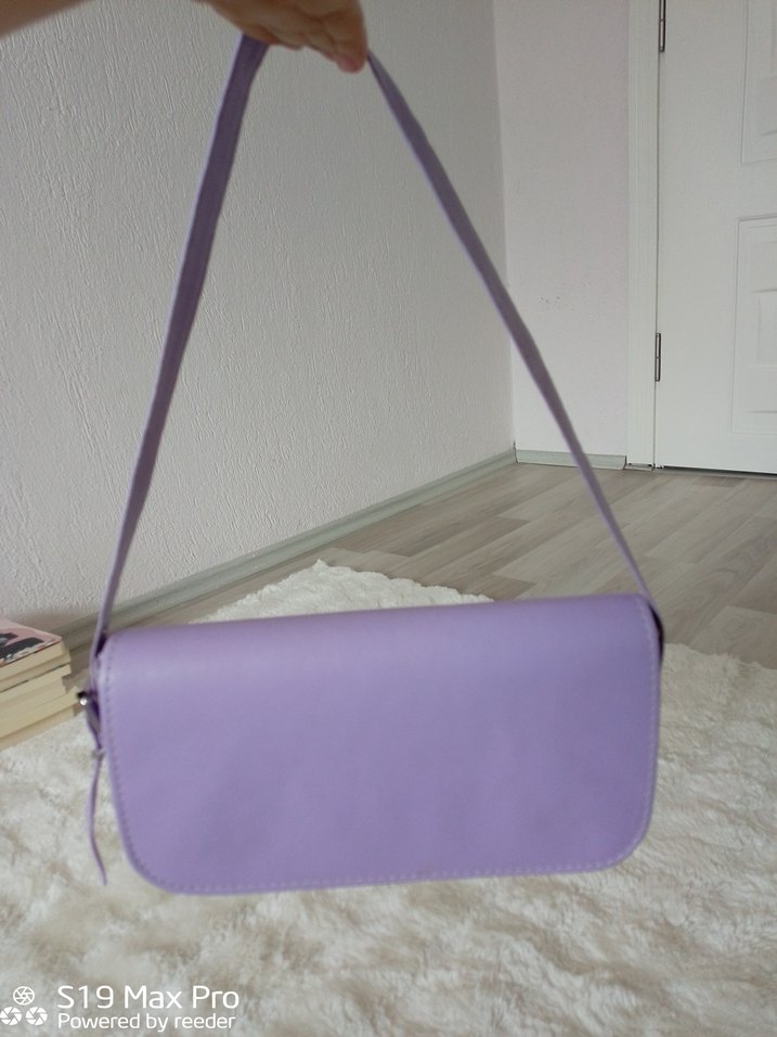 Pastel mor renkte, deri malzemeden yapılmış, tokalı ve desensiz kadın omuz çantası. Minimalist ve bohem tarz için uygundur.
