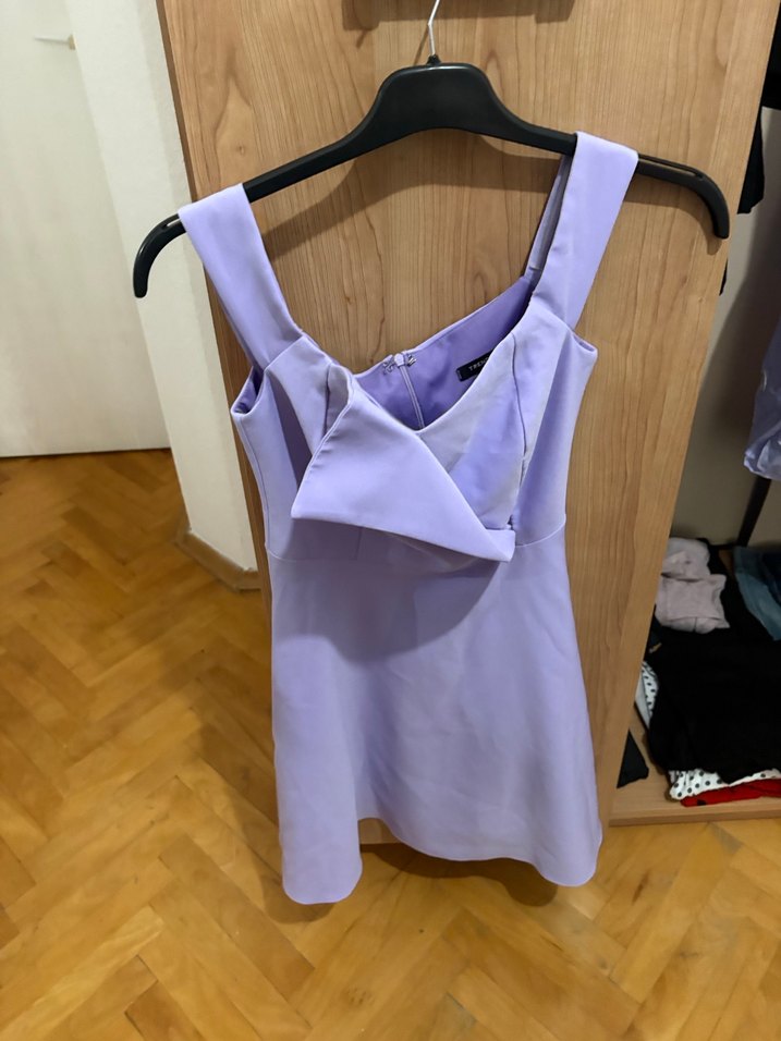 Pastel mor renkte, V yakalı, kolsuz ve drapeli detaylı, vücuda oturan mini elbise. Moda ve avangart sokak stili sunar.