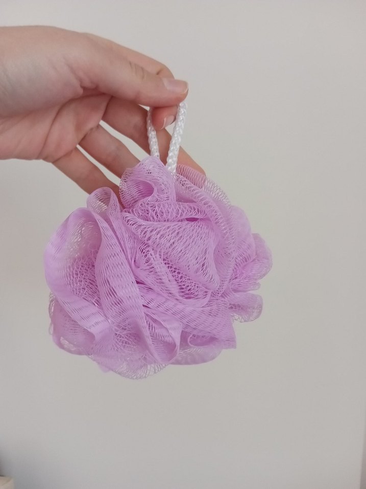 Pastel mor renkte, yumuşak dokulu ve asma ipli duş süngeri.