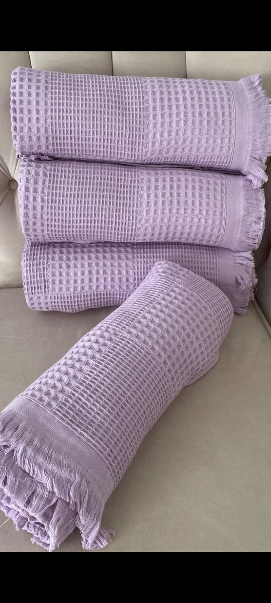 Pastel mor renkte, kare desenli dokusu ve püsküllü kenarlarıyla klasik ve sade tarzda havlular.