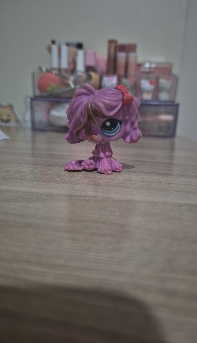 Büyük gözlere ve detaylı saçlara sahip pastel mor küçük figür oyuncak.