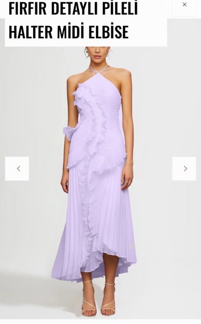 Pastel lavanta renkte, fırfır detaylı, straplez halter yaka uzun abiye elbise. Kolsuz ve regular fit kesimiyle düğünler için uygundur. Hiç giyinilmedi paketli s beden.