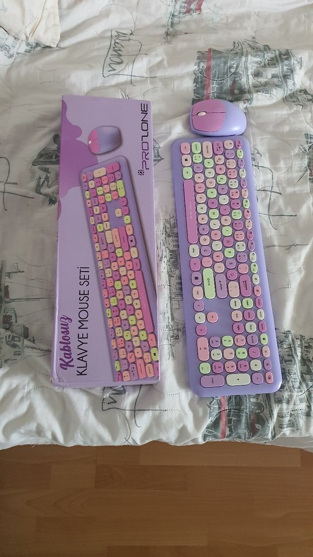 Renkli yuvarlak tuşlara sahip pastel mor kablosuz klavye ve mouse seti, yumuşak ve eğlenceli tasarımla. USB alıcısı dahil.