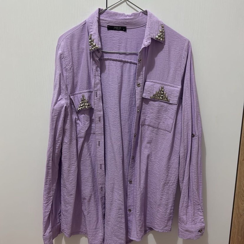 Bol kesim, uzun kollu mor keten gömlek, yakalı ve düğmeli. Yaka ve ceplerde zımbalı detaylar bulunur, günlük sokak stiline uygun.