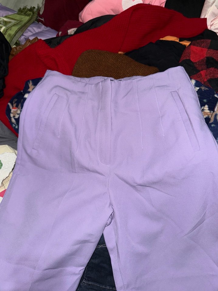 önden kapamalı, yumuşak ve sıcak kumaştan yapılmış pastel mor kadın pantolon, midi boy ve sade desensiz tasarıma sahiptir.