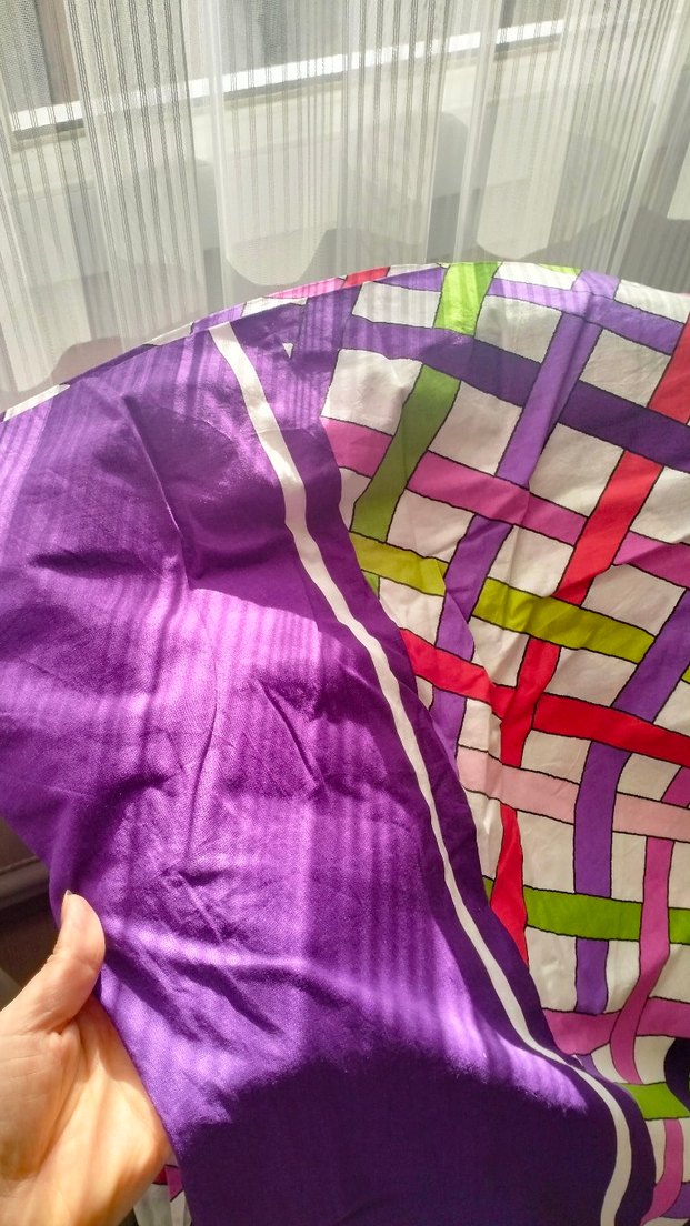 Pastel mor renkte, yumuşak sentetik kumaştan yapılmış, rengarenk çapraz cizgileriyle Minimalist ve normcore stil için uygundur.