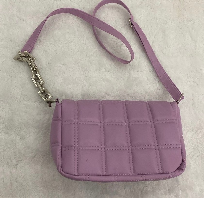 Pastel mor renkte, tokalı askıya sahip, sade ve günlük kullanıma uygun kapitone sentetik kumaş omuz çantası.