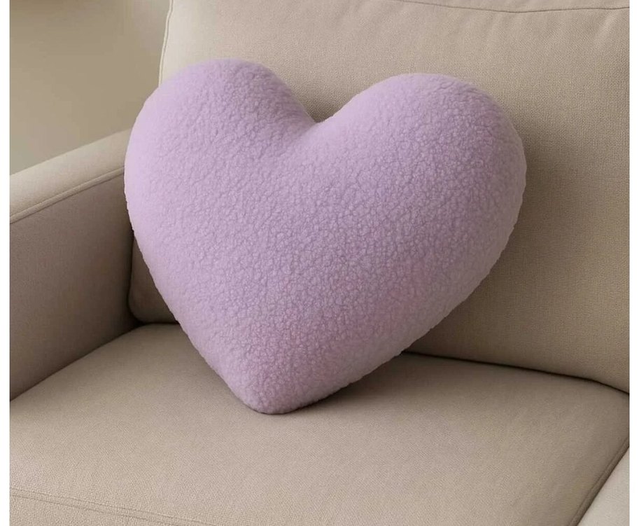Yumuşak dokulu, pastel mor kalp şeklinde yastık. Her ortama sıcaklık katar.