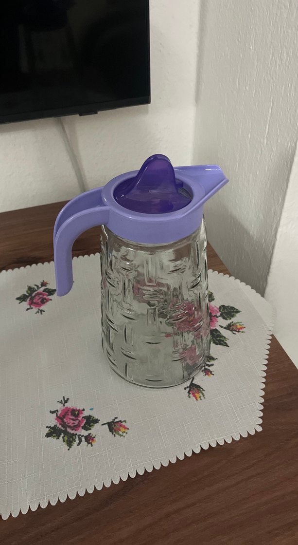 Pastel mor plastik kapak ve saplı, desenli cam sürahi. İçecek servisi için kullanışlı ve şık bir tasarım.