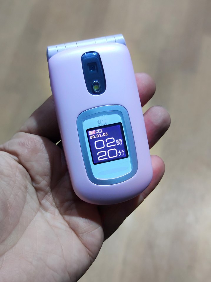 Pastel mor renkli kapaklı telefon, küçük dış ekranında saat ve tarih gösterir, üzerinde kamera bulunur. Kompakt ve taşınabilir. Sadece arka vidası satılıktır.