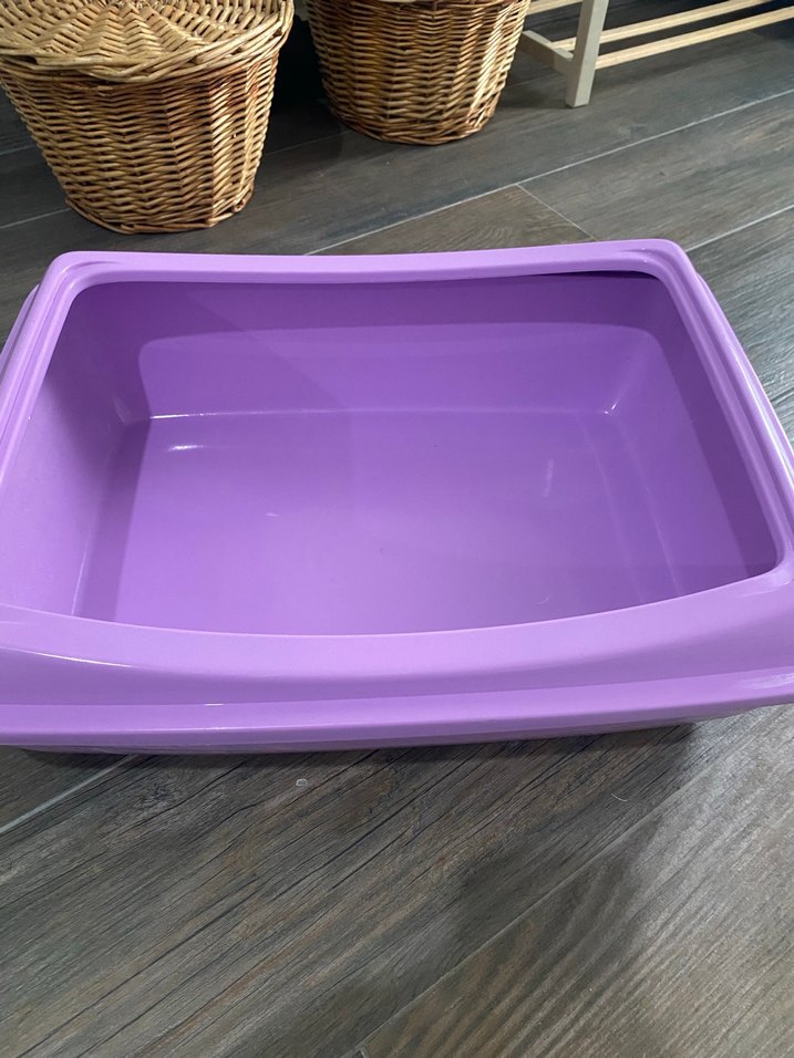 Pastel mor renkte geniş kedi tuvalet kabı, kolay temizlenir ve dayanıklı yapıya sahiptir. Evcil hayvanınız için konfor sağlar.