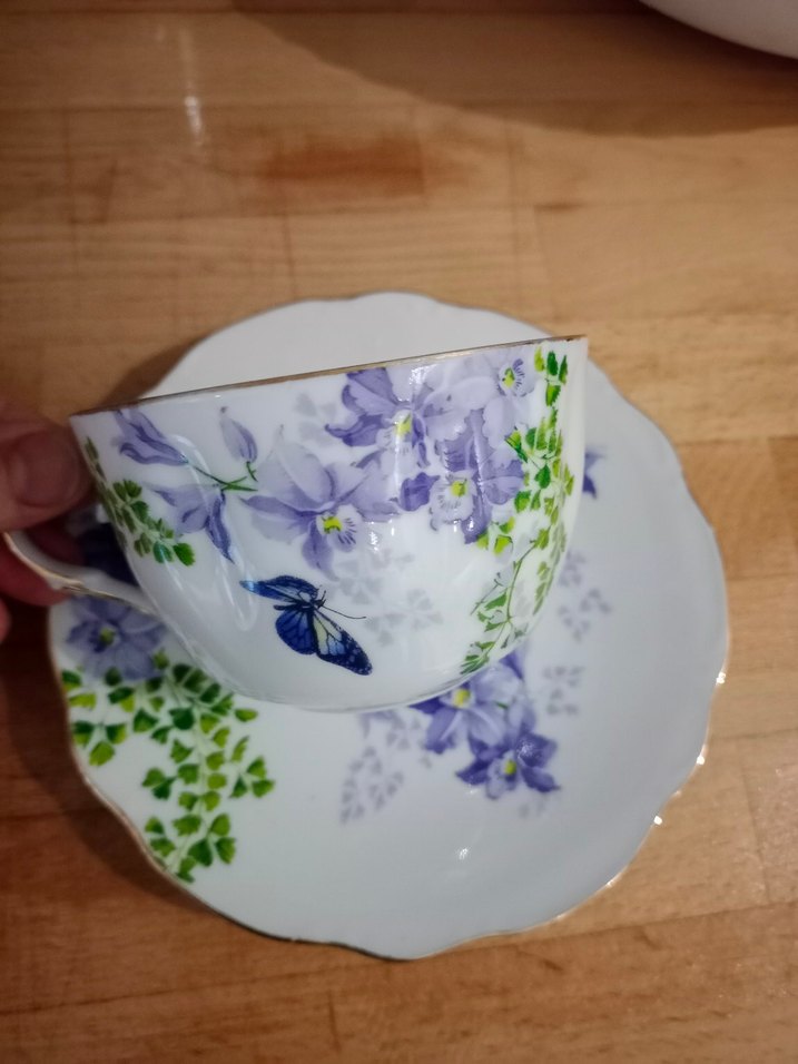 Pastel mor çiçek ve kelebek desenleri ile yeşil yaprak detaylarına sahip porselen fincan ve tabağı, zarif ve şık bir görünüm sunar. Orjinal ince porselen yurtdışı ürün