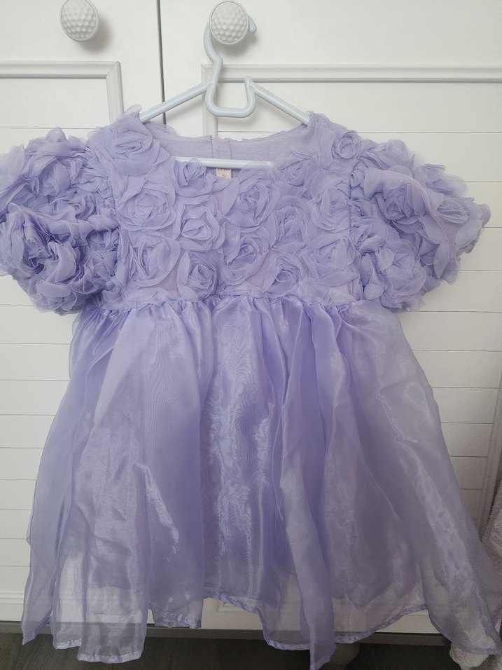 Pastel mor renkte kız çocuk elbisesi, kısa fırfırlı kollara ve bol kesime sahiptir. Sentetik kumaştan yapılmış, bohem tarzındadır.