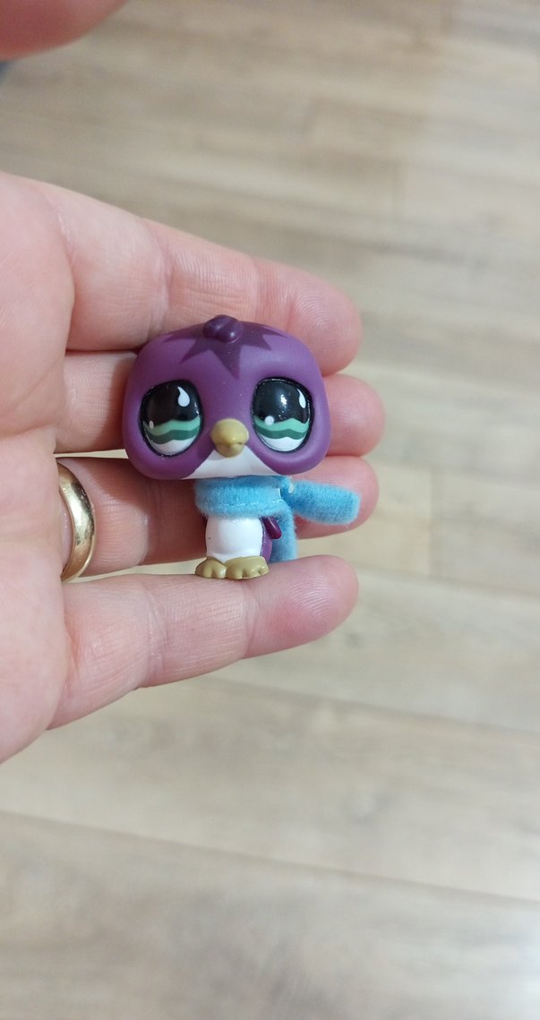 Pastel mor renkte, büyük ifadeli gözlere sahip kuş figürü, yumuşak mavi atkıyla birlikte elde rahatça tutulur.