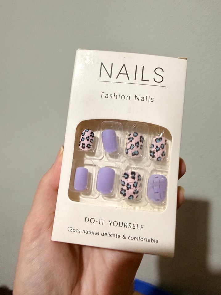 Pastel mor renkte, leopar desenli ve doğal rahatlıkta 12 parça tırnak süsü seti. Kendin yap uygulaması için uygundur.