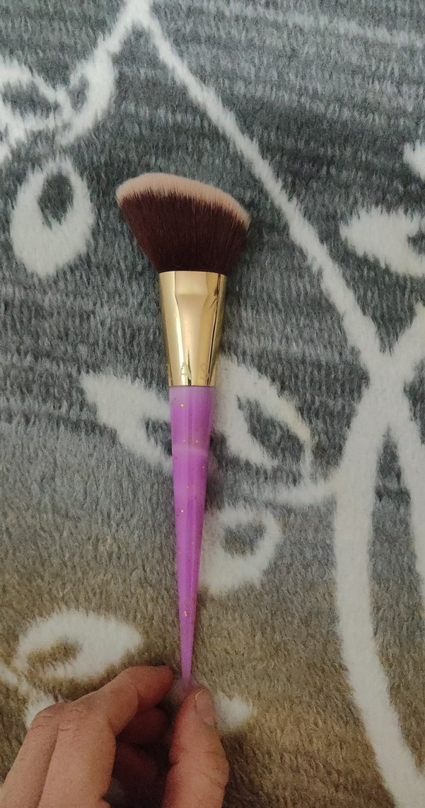Pastel mor renkte, yumuşak açılı kıllara ve rahat tutuş sağlayan sap kısmına sahip makyaj fırçası.