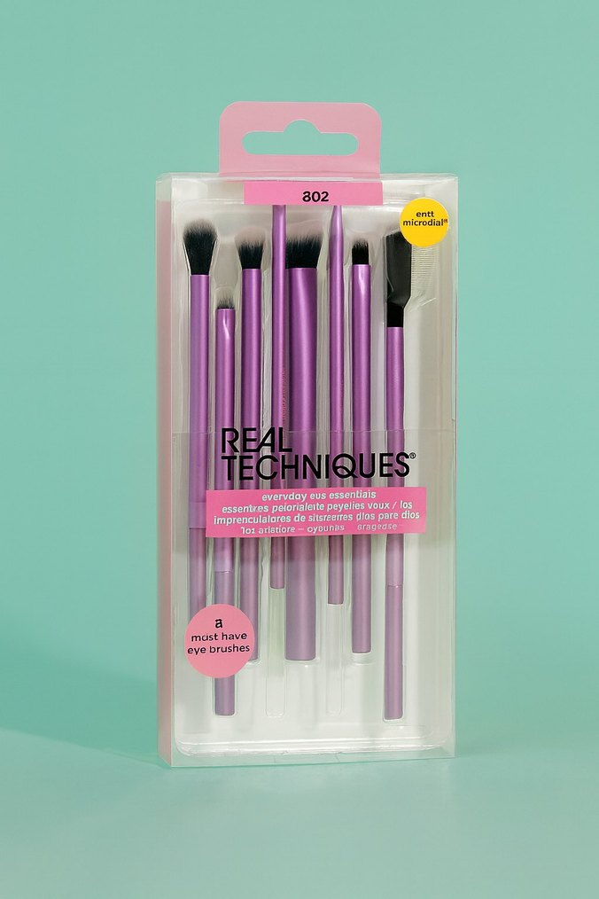 Pastel mor renkte, göz makyajı için çeşitli şekillerde yumuşak kıllı fırça seti. Real Techniques 802 modelidir.