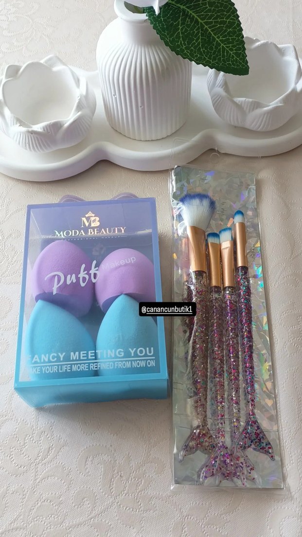 Parlak saplı pastel mor makyaj fırçaları ve yumuşak makyaj süngerleri içeren set. ️ iki setin fiyatıdır