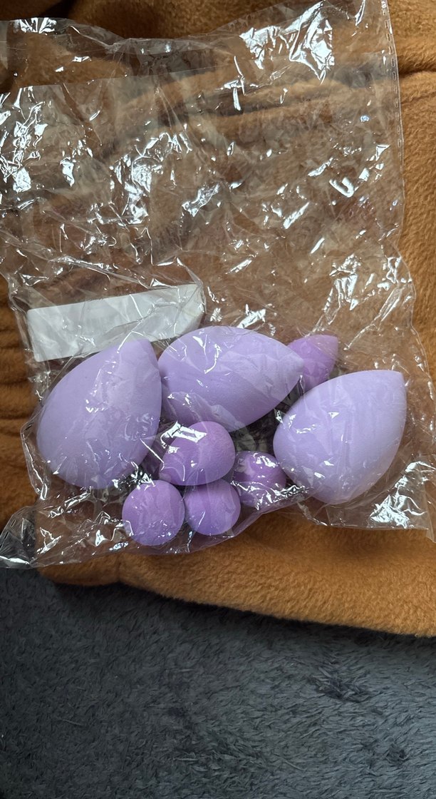 Farklı boyut ve şekillerde pastel mor renkte makyaj süngerleri seti, fondöten ve diğer kozmetik ürünleri uygulamak için uygundur.