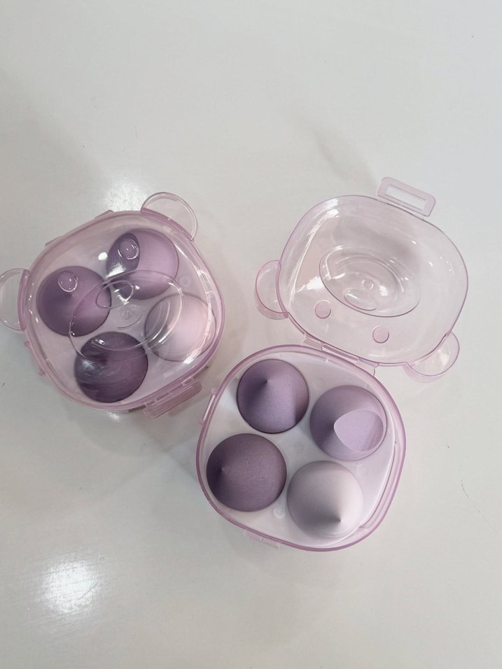Farklı şekillerde pastel mor makyaj süngerleri, şeffaf kutuda düzenli şekilde saklanır.