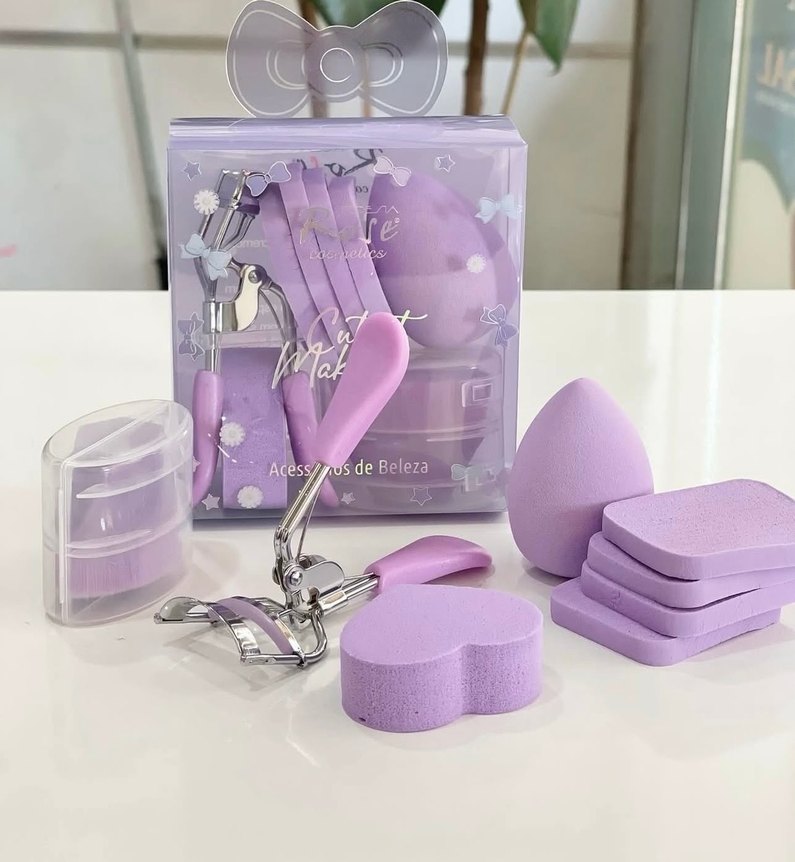 Pastel mor renkte, çeşitli şekillerde yumuşak makyaj süngerleri ve kirpik kıvırıcı içeren set. Pürüzsüz makyaj için uygundur. ✨
