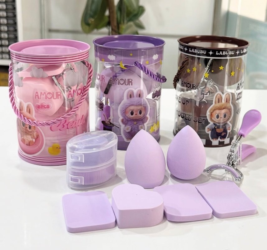 Pastel mor renkte çeşitli şekillerde makyaj süngerleri ve küçük bir kap ile birlikte gelir. Paket üzerinde sevimli karakter tasarımları ve 'MOUR' yazısı bulunur. Labubu kutulu