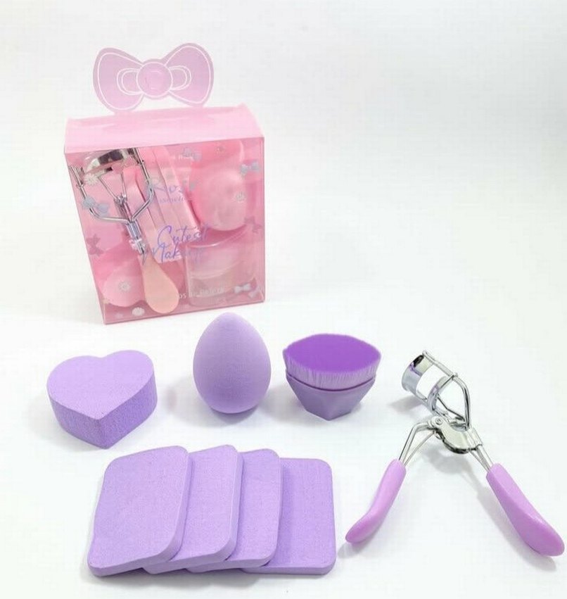 Pastel mor renkte farklı şekillerde makyaj süngerleri ve yumuşak saplı kirpik kıvırıcı seti.