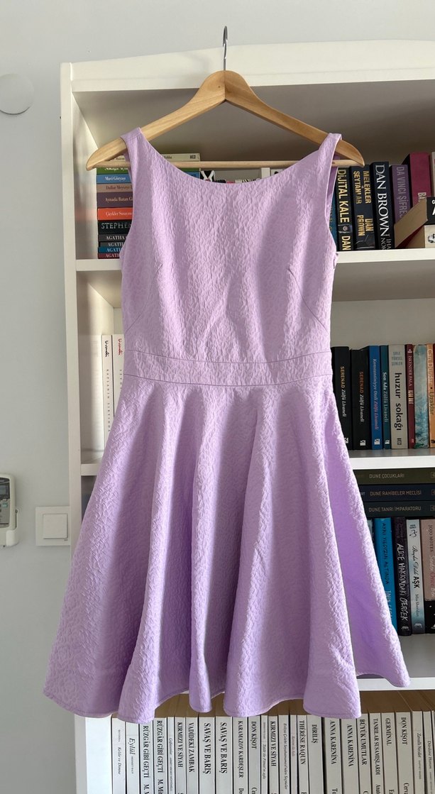Askısız, straplez yaka ve pileli etekli pastel mor midi elbise. Normal kesim, klasik ve normcore tarzda, ofis için uygun.
