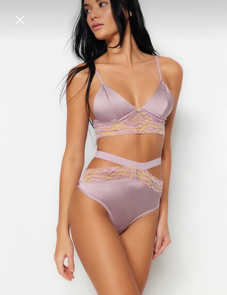 Pastel mor tonlarında, kısa mini uzunlukta, dantel detaylı ve desen içermeyen bohem tarzda sütyen.