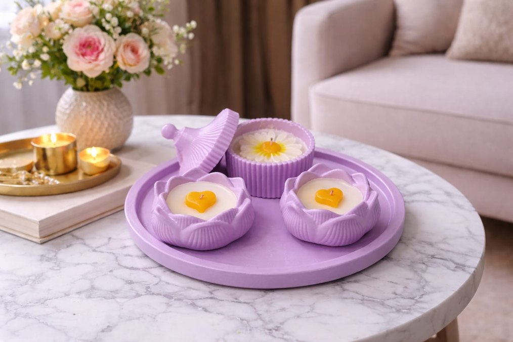 Pastel mor renkte, kalp figürlü iki çiçek şeklinde mum ve papatya desenli yuvarlak mum, uyumlu tepsi üzerinde sunuluyor. ️