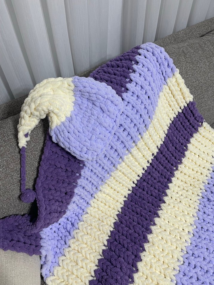 Pastel mor ve krem renkli çizgili yumuşak örgü çocuk battaniyesi. Rahat ve konforlu kullanıma uygundur. Yumuşacık bebek battaniyesi