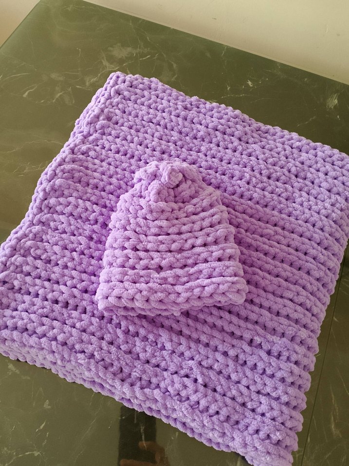 Pastel mor renkte yumuşak örgü bebek battaniyesi ve uyumlu şapka, çocuklar için sıcaklık ve konfor sağlar.