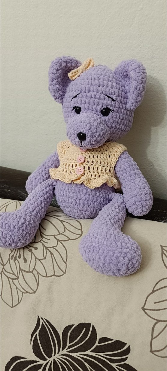 Yumuşak pastel mor renkte peluş ayıcık, krem örgü yelek ve fiyonk detayıyla. Yüzü işlenmiş detaylara sahip.