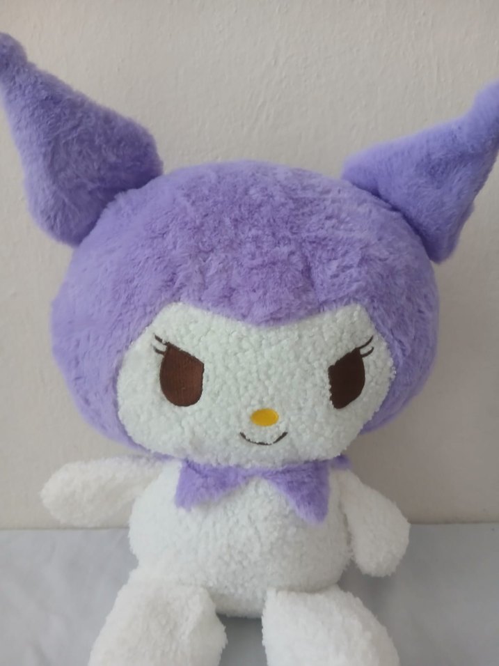 Pastel mor ve beyaz renkli, büyük kulaklı ve sevimli yüzlü yumuşak peluş oyuncak.