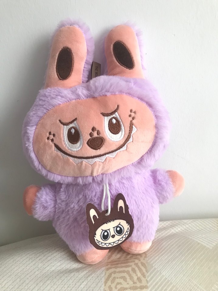 Nakışlı yüz detaylarına ve küçük askılı etikete sahip yumuşak pastel mor peluş tavşan oyuncak.