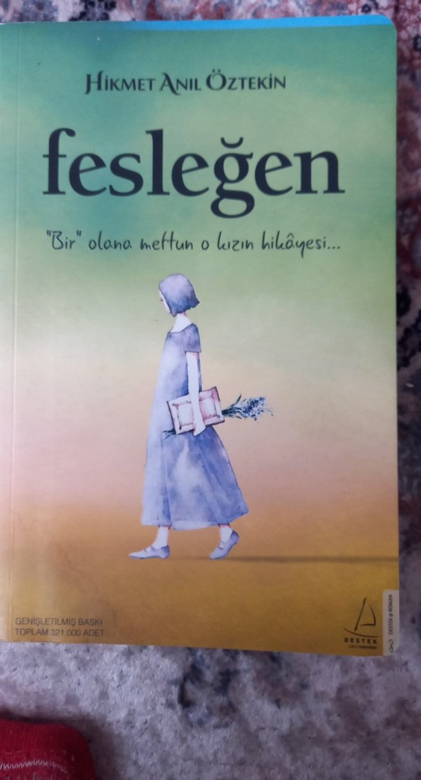 Pastel mor kapaklı "Fesleğen" kitabında, kitap ve çiçek tutan bir kızın illüstrasyonu yer alıyor. Üzerinde "Bir olana meftun o kızın hilayesi..." yazıyor.