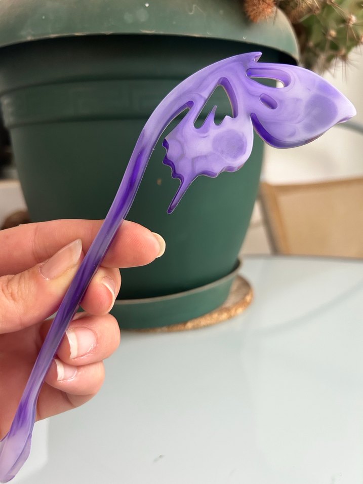Pastel mor renkte, sanatsal tasarımlı sapı olan saç Tokası. Fonksiyon ve şıklığı bir arada sunar. İki adet fiyatıdır.