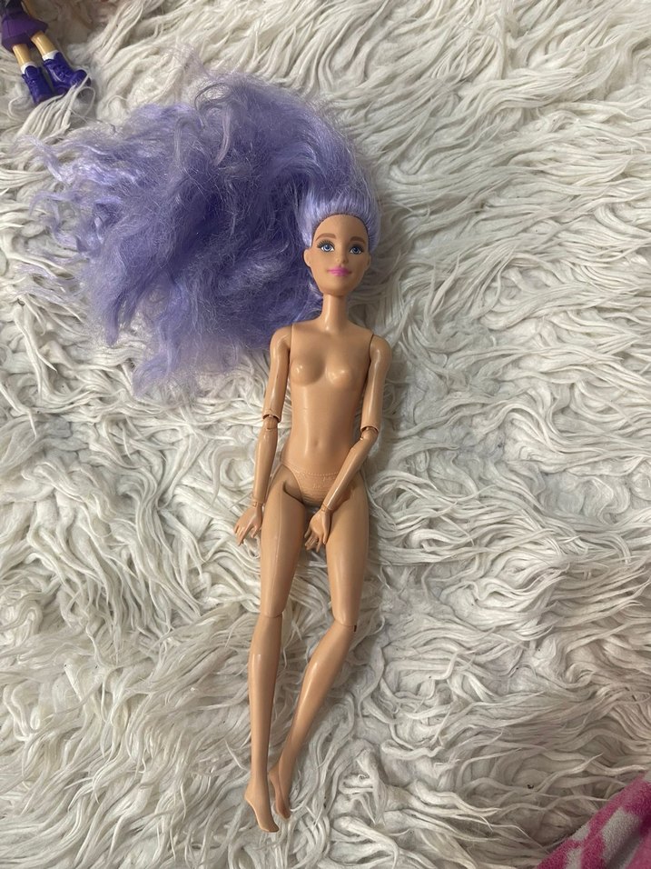 Pastel mor saçlı, eklemli hareket kabiliyetine sahip bebek. Kıyafetleri yoktur.