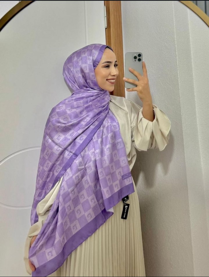 Pastel mor renkte, saten dokulu ve drapeli tasarıma sahip kadın şalı, mütevazı ve bohem sokak stilini yansıtıyor.