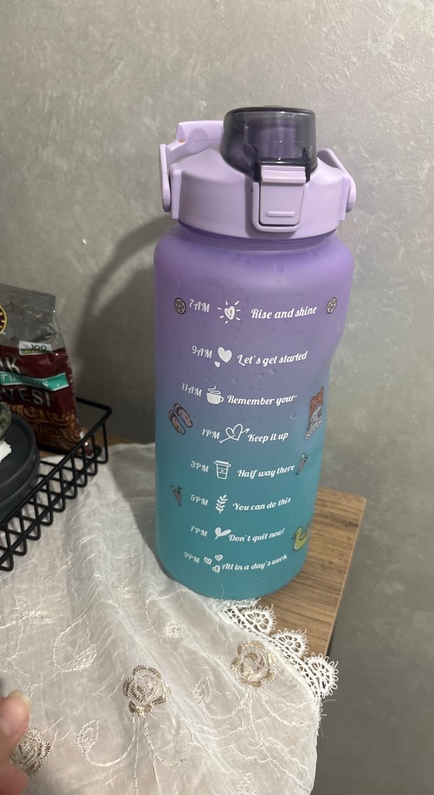 Pastel mor renkte, gün içinde su içmeyi teşvik eden zaman işaretleri ve motive edici ifadeler bulunan su matarası Kolay kullanım için güvenli açılır kapanır içindeki pipeti kayboldu