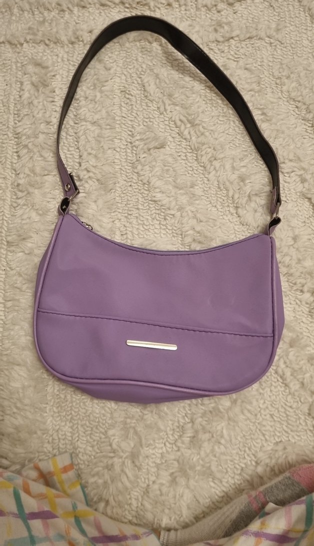 Pastel mor paraşütümsü malzemeden yapılmış, tokalı askısı olan minimalist kadın omuz çantası, günlük kullanıma uygundur.