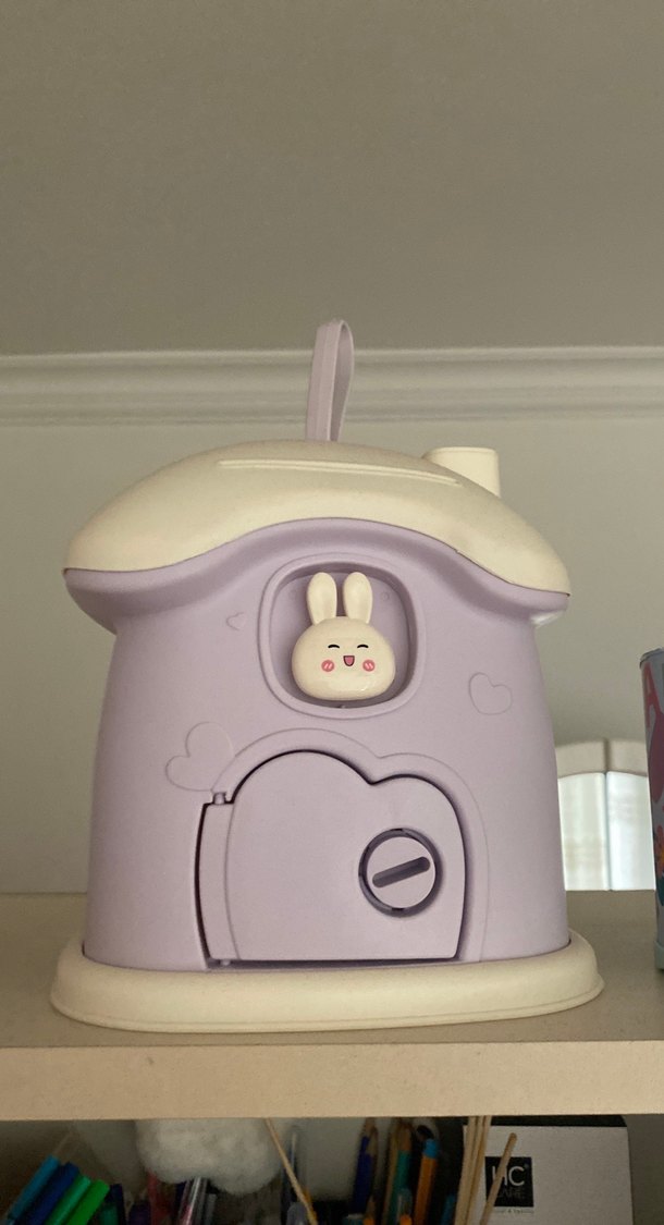 Pastel mor renkte, küçük ev şeklinde kumbara. Sevimli tavşan figürü ve küçük kapısı bulunur. Yumuşak, çocuk dostu tasarım. normalde anahtarı var ama kaybetmişim ama tırnağınızla açılıyor kapak
