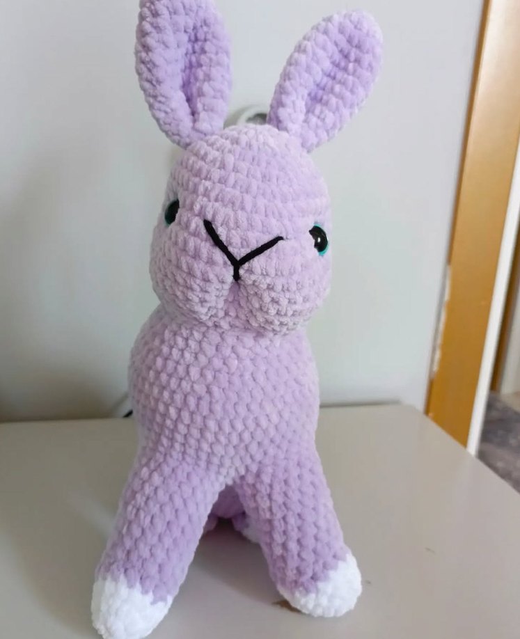Yumuşak dokulu, pastel mor renkte tavşan şekilli peluş oyuncak, beyaz uçlu patiler ve işlemeli yüz detaylarıyla.