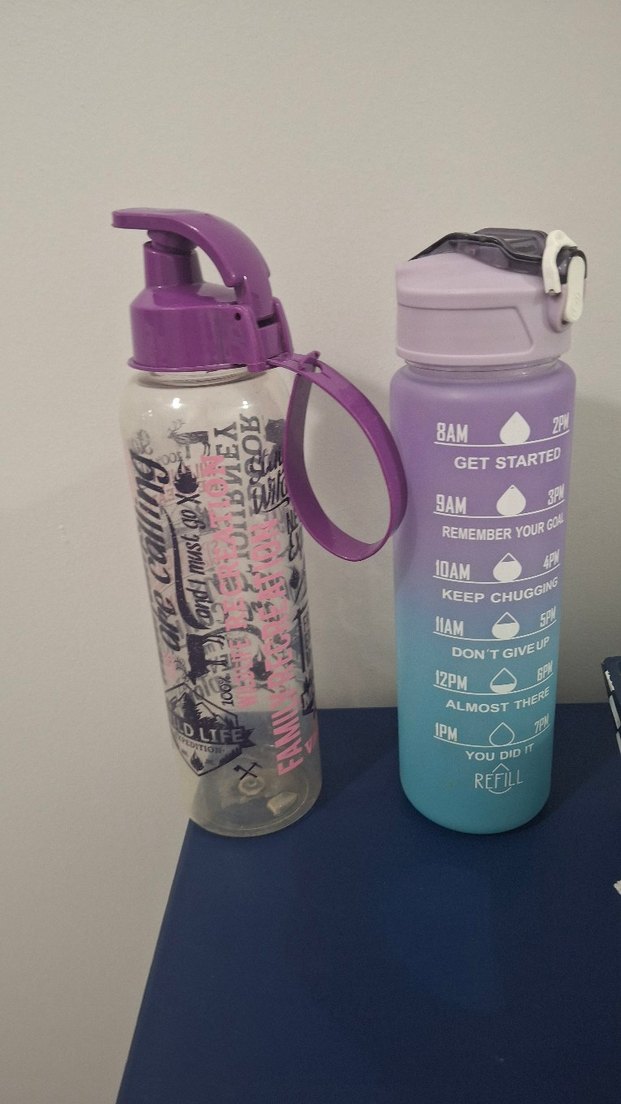 Pastel mor renkte, 8 AM'den 1 PM'e kadar motivasyonel zaman işaretleri bulunan çocuk termos şişesi. Kapak açılır ve taşıma halkası mevcuttur.