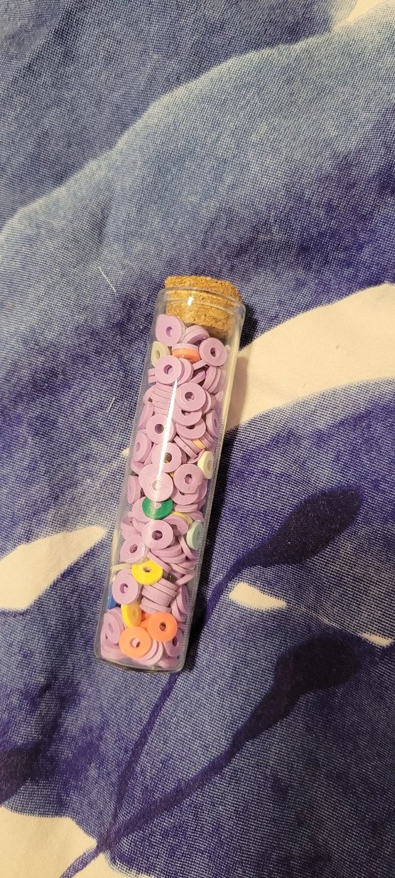 Küçük cam şişede pastel mor renkte yuvarlak tırnak süslemeleri, bazıları diğer pastel renklerde. Yaratıcı tırnak tasarımları için uygundur.