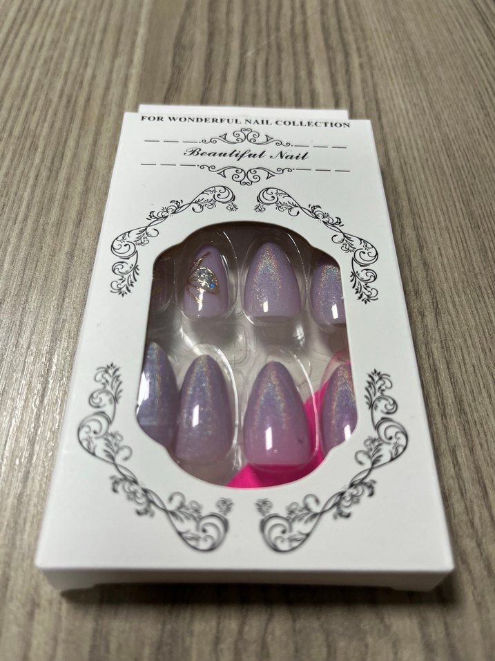 Pastel mor renkte, hafif ışıltılı ve zarif süslemeli yapay tırnaklar. 24 adet tırnak 24 adet yapıştırıcı bir adet Törpü