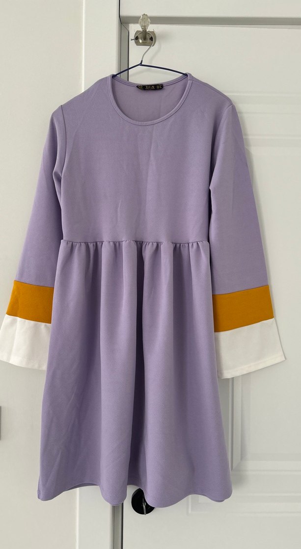 Pastel mor renkte, salaş kesim midi tunik. Uzun kollu ve bele plise detaylıdır. Kol uçları hardal ve beyaz renkte renk blokludur. Yumuşak sentetik kumaştan üretilmiştir.