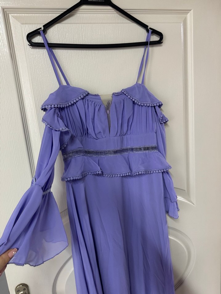 V yaka ve askılı, volan detaylı, uzun ve vücuda oturan pastel mor abiye elbise. Bohem gotik tarzıyla parti için uygun.