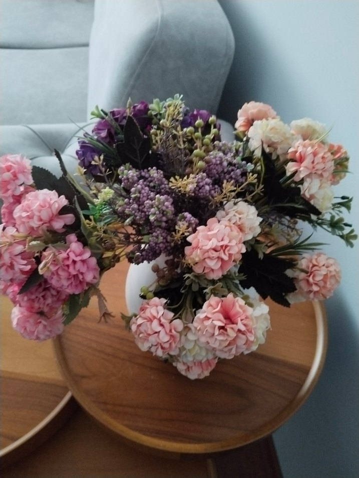 Pastel mor ve pembe tonlarında yapay çiçekler ve yeşil yapraklarla yumuşak bir dekoratif dokunuş sağlar.